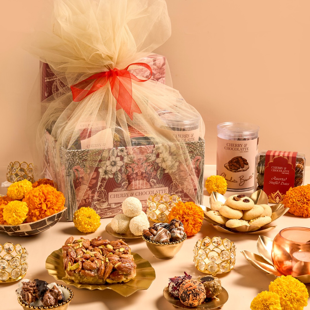 Caramel coconut bites -Assorted cookies -Nutty Shortbread -Chocolate coated nuts -Chocolate biscotti -Stuffed Dates -Assorted chocolate truffles -Butter Palmier