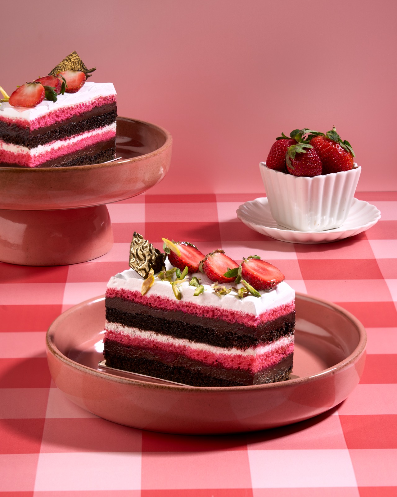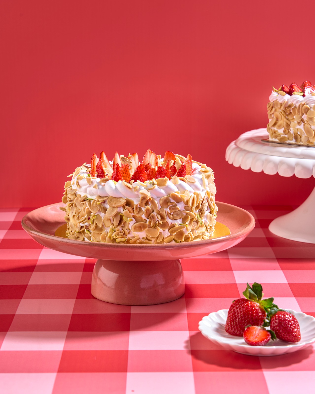 Delicate cake layered with luscious fresh cream and strawberry bursts.